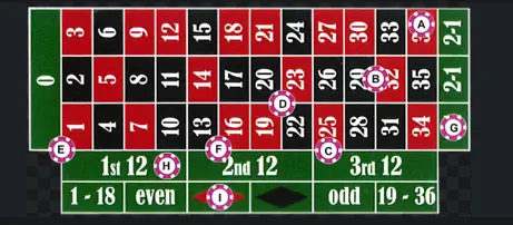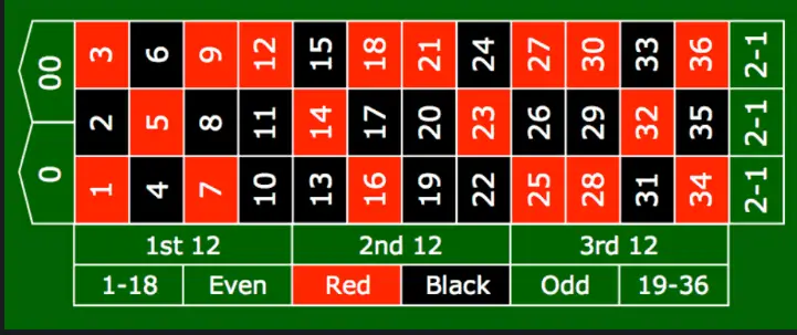 标准的 轮盘游戏 由 1 至 36 的数字组成,并搭配绿色的 0(部分版本包含 00)。